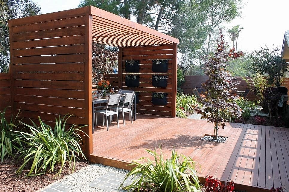 - Перголы из планкена – опоры для вьющихся растений, истинное украшение, создающее приватную зону для отдыха с защитой от солнца и ветра.