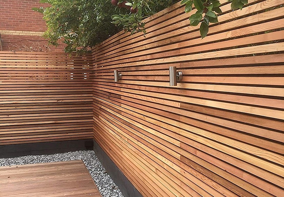 - Красивое ограждение из прямого или скошенного планкена. Высокий забор или низкий декоративный.