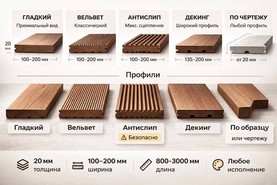 Палубная доска из термоясенябывает с гладкой или рифленой поверхностью, последняя не скользит при намокании, что удобно для использования в саунах и бассейнах. Единственный минус - может слегка поменяться цвет под влиянием ультрафиолета.